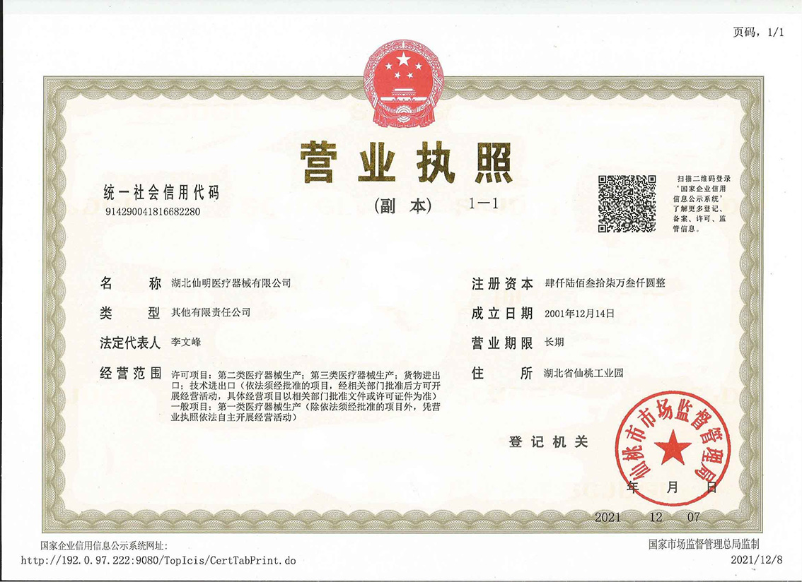 本公司已通過SO13485體系認證。近幾年獲得的各項榮譽有∶全國質量穩定合格產品、湖北省著名商標、湖北省守合同重信用企業,湖北省著名企業、湖北省最佳創新型民營企業、仙桃市知名商標等榮譽。